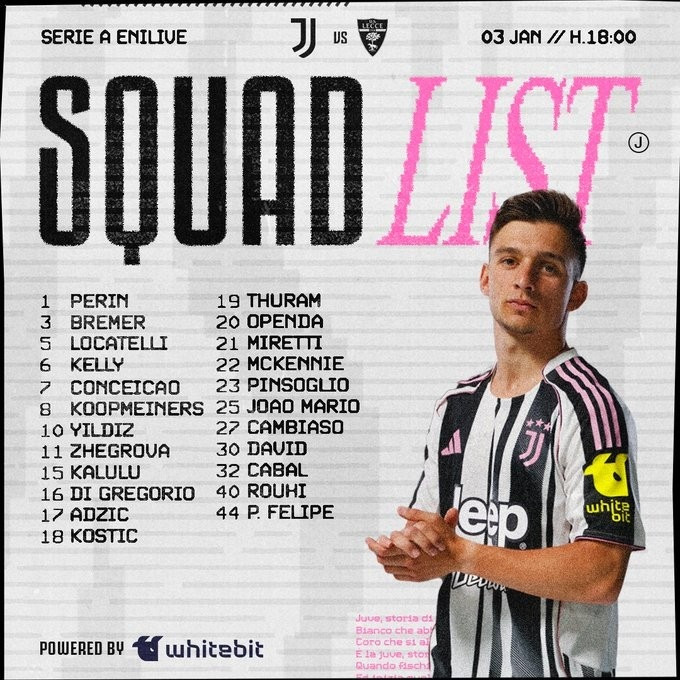 直播吧1月3日讯北京技术1月4日周四凌晨1点,尤文图斯将介意甲主场迎战莱切,球队当今公布了比赛大名单。